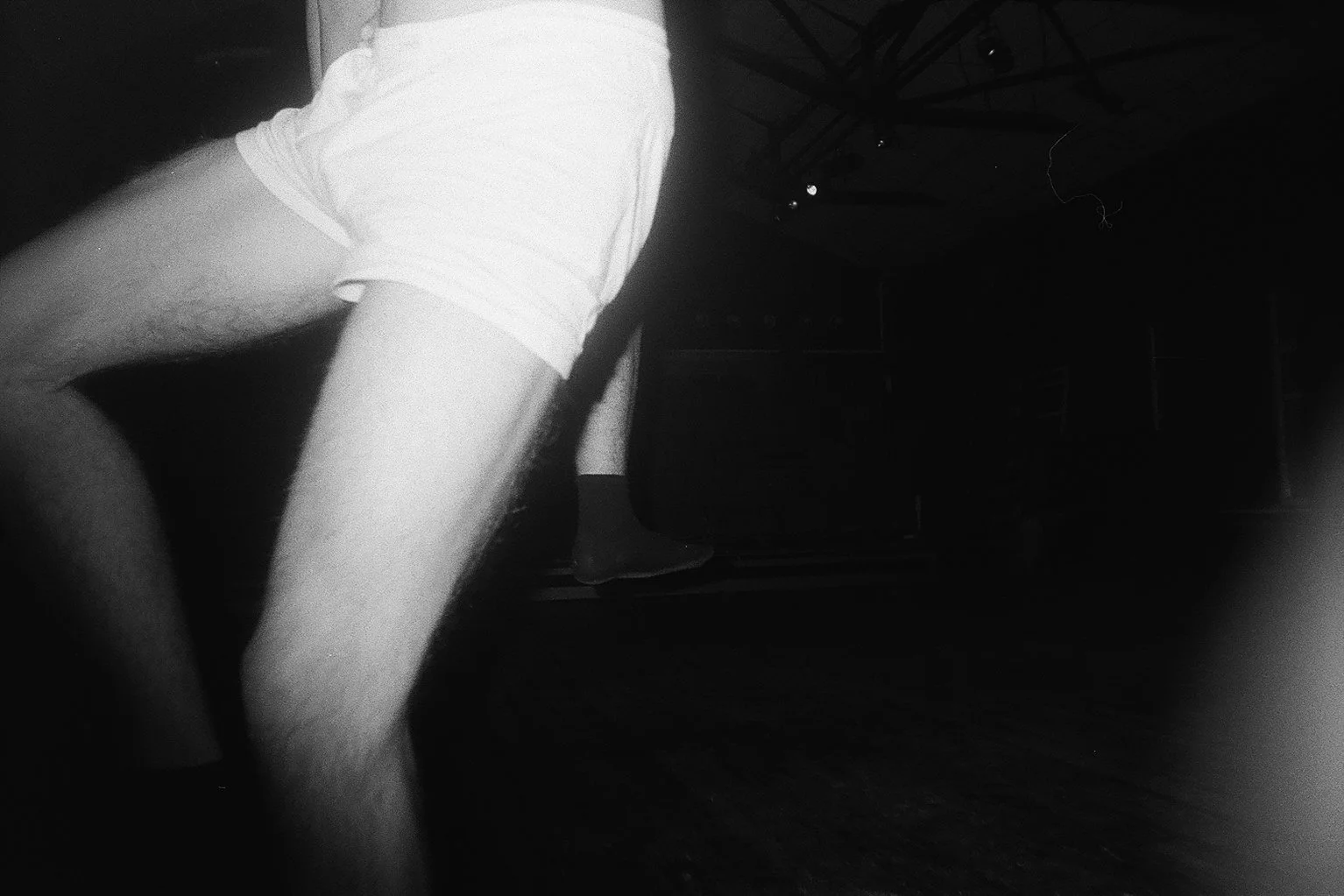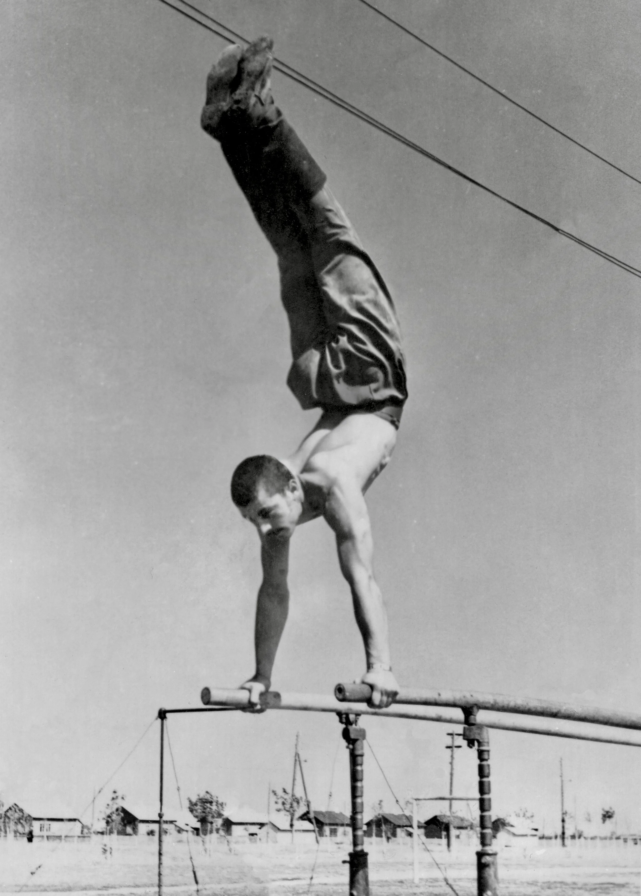 A young man performing a handstand on parallel bars outdoors in black and white photograph.